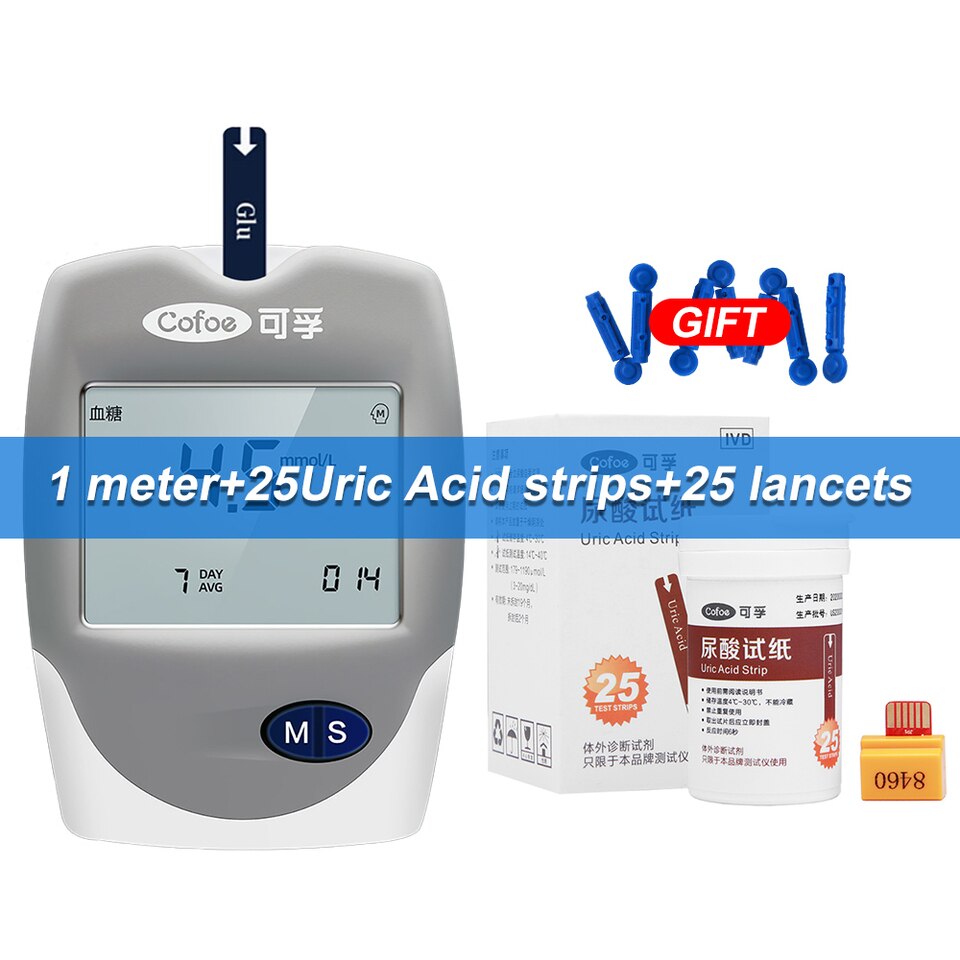 meter with 60strips, one meter, 1meter 25glucose, 1meter 25Uric Acid, 1meter 10Cholesterol |